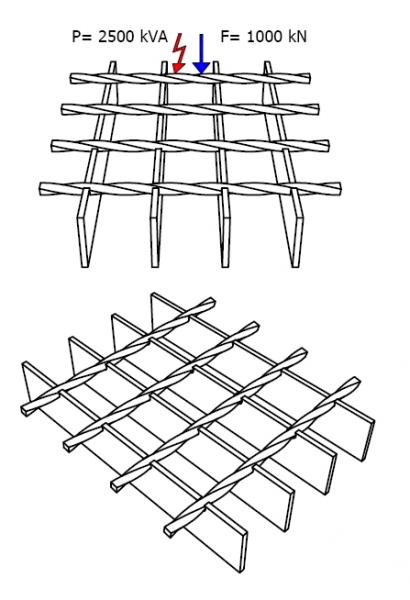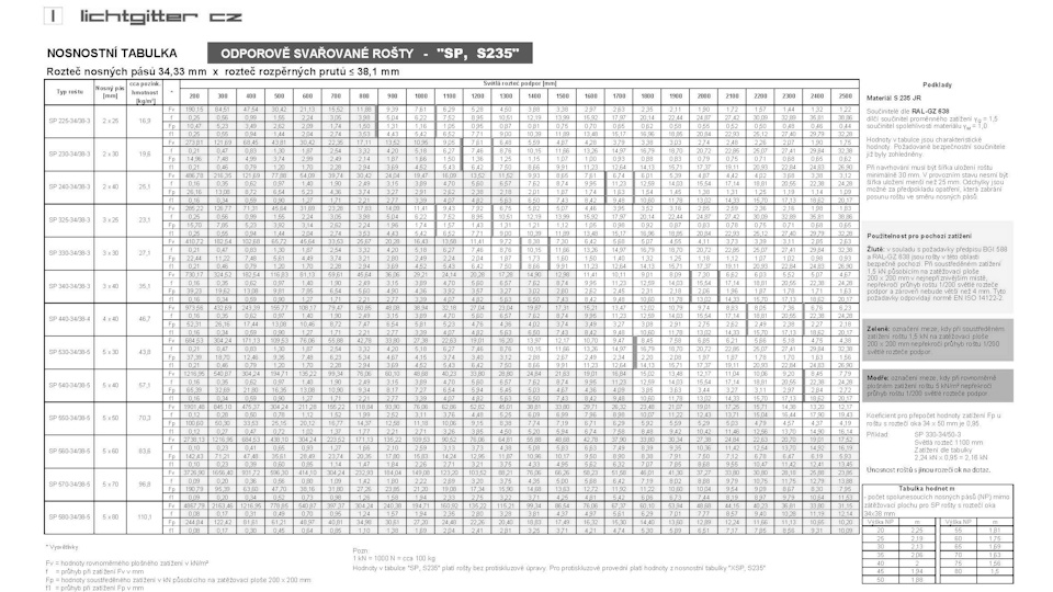 The load-bearing structure of the grating consists of steel flat bars, whose mutual position and stability are ensured by cross bars. The cross bars are made of drawn twisted wire. In addition to ensuring the position and stability of the bearing bars, the cross bars serve to partially redistribute the load to bearing bars outside the loaded area. This fact is also taken into account in the static calculation for grating dimensioning.