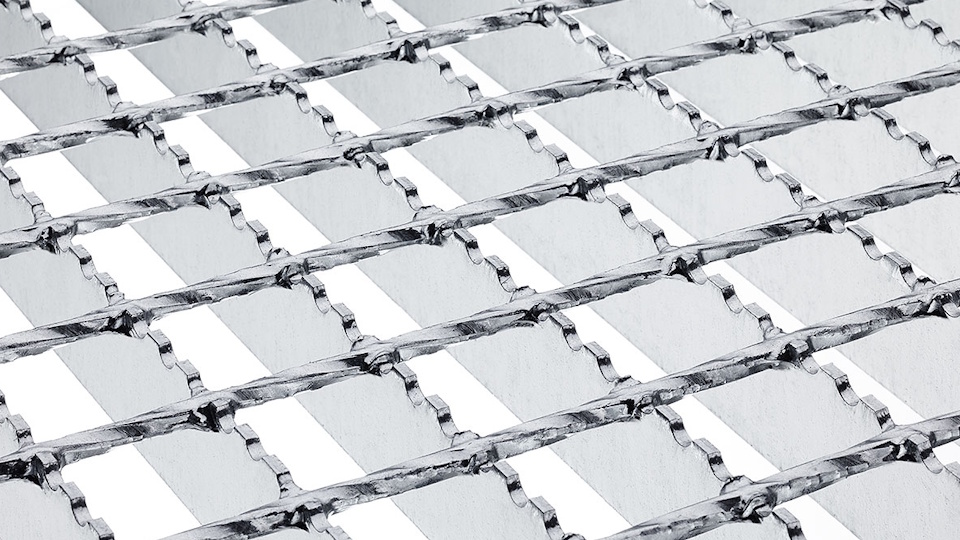The cross bars are welded into the non-weakened bearing bars by applying a current of up to 2500 kVA and simultaneously exerting pressure of up to 1000 kN. Thanks to high-quality fusion at the contact points, the resulting “mesh” structure has both high strength and the ability to favourably redistribute the load. The gratings are edged in the transverse direction by a process in which the edging strip with a double groove is welded at two points along the entire length to each bearing bar. Edging is carried out on an automatic welding unit, which guarantees the highest weld quality. The corners are additionally secured by a spot weld. Only for atypical sizes and shaped gratings are the edging strips welded manually.