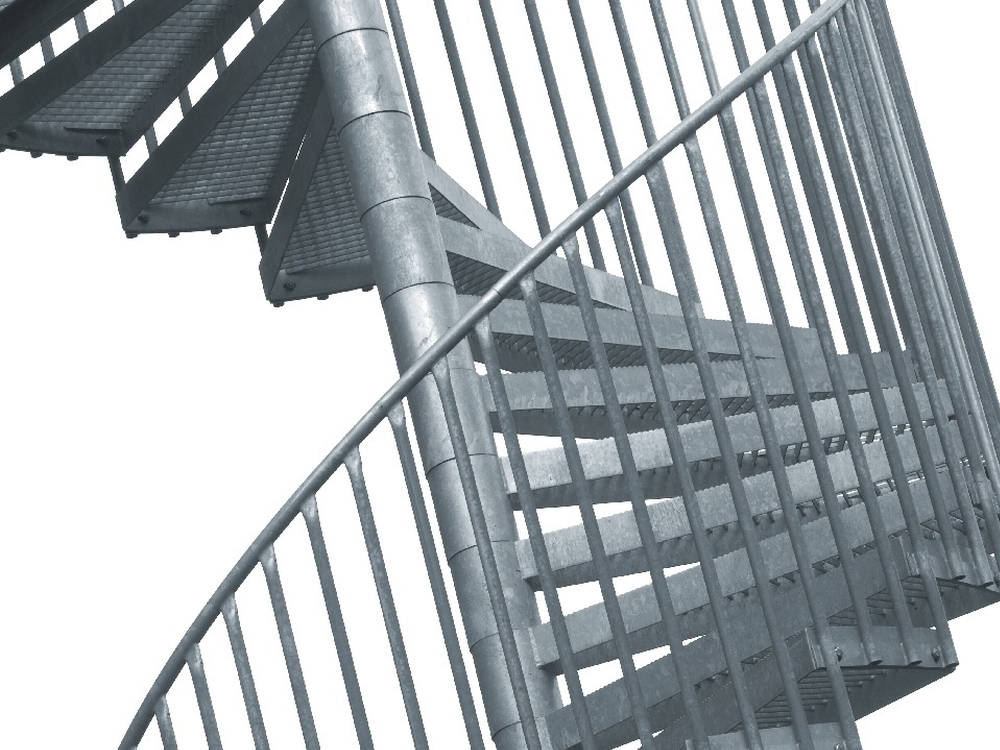 Čelična spiralna stubišta s gazišnom površinom od rešetki. Prikladna za male tlocrtne površine.