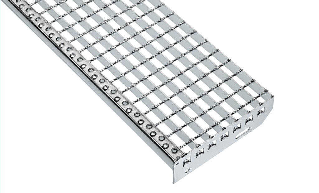 Gazišta za stepenice od rešetki ili limenih profila s navarenom bočnom pločom i gazišnim rubom. Prikladna za pričvršćivanje vijcima na nosače stepenica.