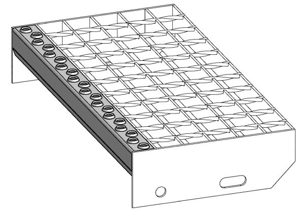 Profil přivařený ke schodišťovým stupňům a podestám, za účelem zabránění sklouznutí, zvýšení nosnosti a k optickému zvýraznění přední hrany schodišťového stupně.